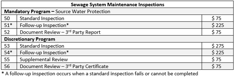 Fees for the Sewage System Maintenance Inspection program are listed in Schedule A of the Township's 2024-31 Building By-law and are shown below.