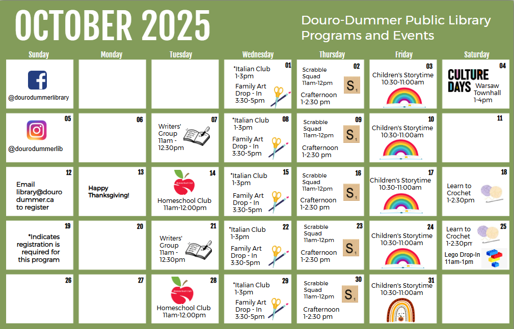 There are several ways to keep up to date with what's going on at the library. Check out the Douro-Dummer Township events calendar to learn about upcoming events. You can also subscribe to the library newsletter by emailing the library, or follow us on Facebook and Instagram where we post regularly about services, programs, and events.