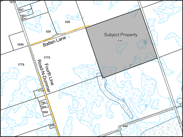 The property subject to this application is shown on the key map above and is located within Part of Lot 24, Concession 4, Dummer Ward, in the Township of Douro-Dummer, in the County of Peterborough, municipally known as 539 Batten Lane and assigned Roll Number 1522-020-004-17100.
